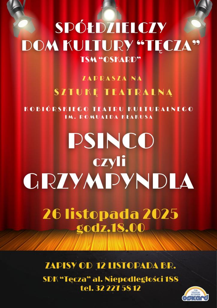 26 listopada o godz. 18.00 w SDK „Tęcza” Kobiórski Teatr Kulturalny im. Romualda Kłakusa wystawi sztukę „Psinco, czyli grzympyndla” w reżyserii Piotra Adamczyka. Autorem scenariusza jest Grzegorz Sztoler, który wystąpi gościnnie w tym spektaklu. Na scenie zobaczymy ośmiu aktorów. Widzów czeka spora dawka dobrego humoru. Wstęp wolny!