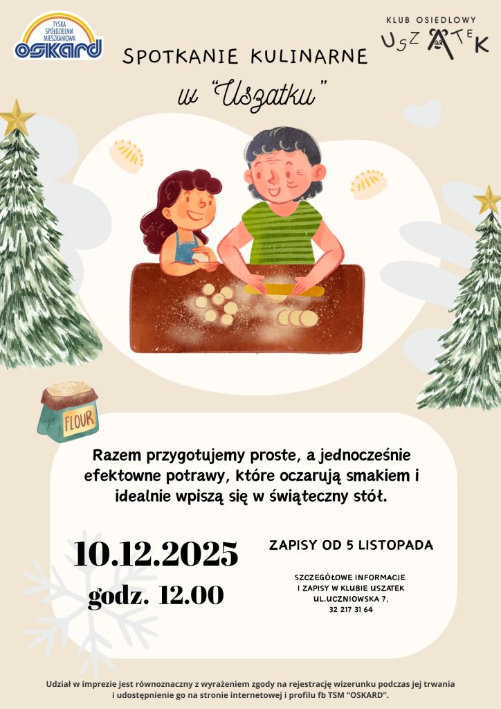 Klub Osiedlowy "Uszatek" zaprasza na świąteczne spotkanie kulinarne w dniu 12.12.2025 o godz. 12.00Ze względu na ograniczoną ilość miejsc, obowiązują zapisy od 05.11.2025.Bliższe informacje w placówce, tel. 32 217 31 64 Opublikowano: 2025-10-30 Kultura