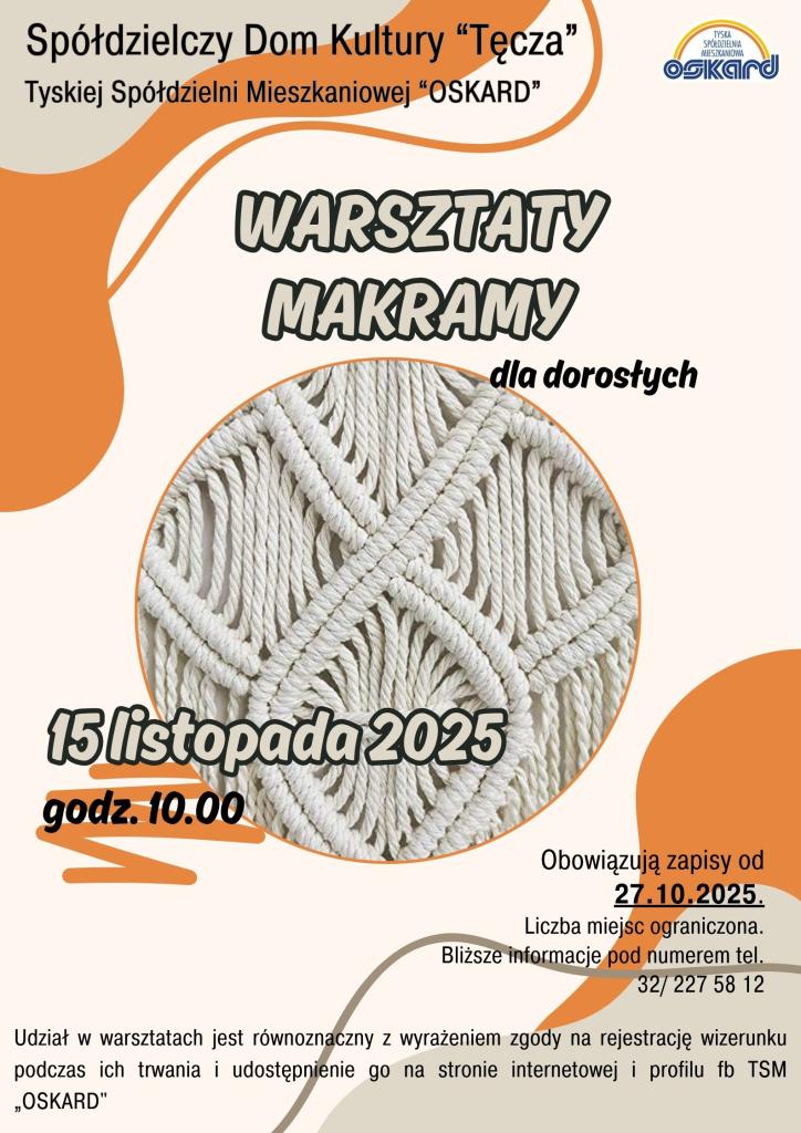 SDK "Tęcza" zaprasza na warsztaty makramy dla dorosłych 15 listopada 2025 r.Obowiązują zapisy od 27.10.2025, tel. 32 227 28 12 Opublikowano: 2025-10-27 Kultura