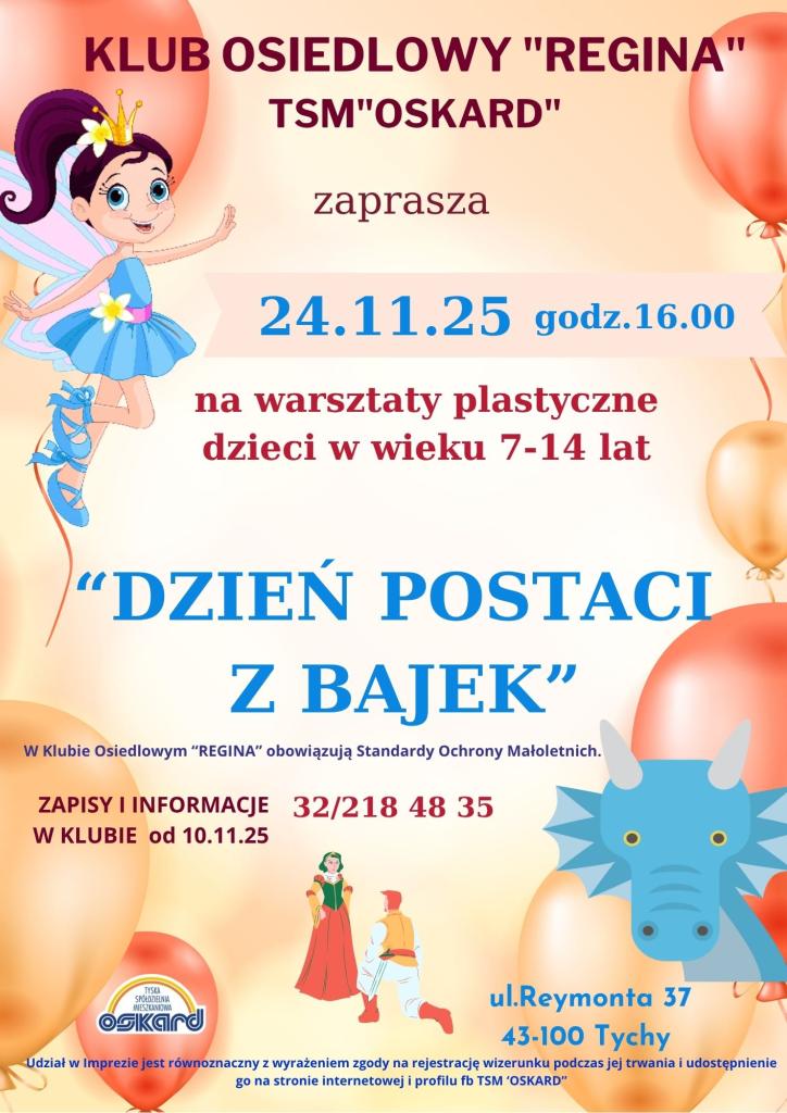 Klub Osiedlowy "Regina" zaprasza dzieci na warsztaty plastyczne z okazji Dnia postaci z bajek w dniu 24.11.2025.Bliższe informacje na załączonym plakacie oraz w placówce, tel. 32 218 48 35 Opublikowano: 2025-11-18 Kultura
