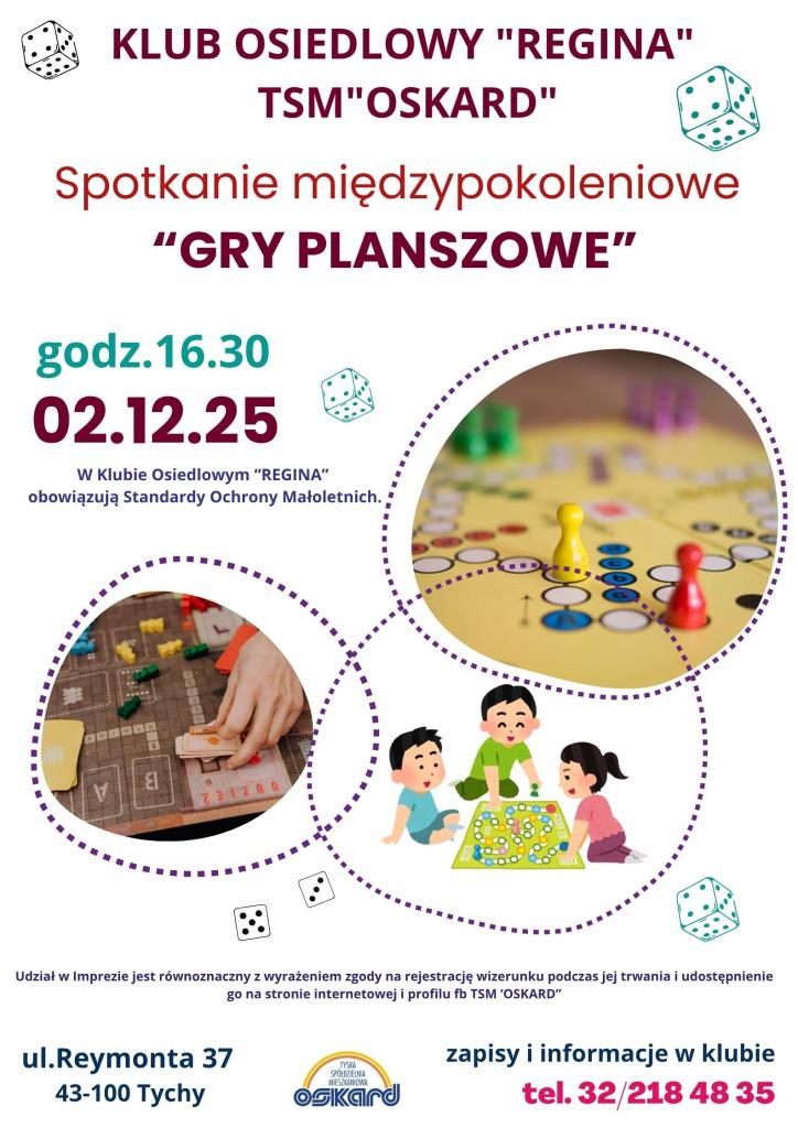 Klub Osiedlowy "Regina" zaprasza na międzypokoleniowe spotkanie przy planszówkach w dniu 02.12.2025 r o godz. 16.30.Bliższe informacje na załączonym plakacie oraz w placówce, tel. 32 218 48 35 Opublikowano: 2025-11-24 Kultura