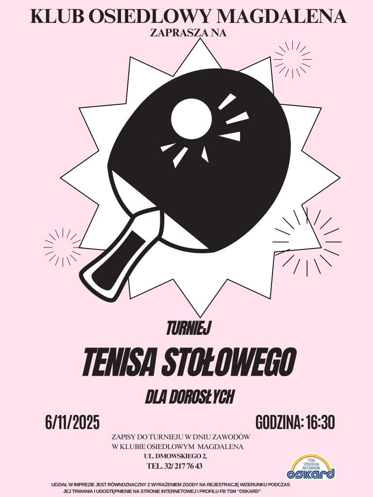 Klub Osiedlowy "Magdalena" zaprasza dorosłych do udziału w turnieju tenisa stołowego 6.11.2025 o godz. 16.30.Bliższe informacje w placówce, tel. 32 217 76 43 Opublikowano: 2025-10-31 Kultura