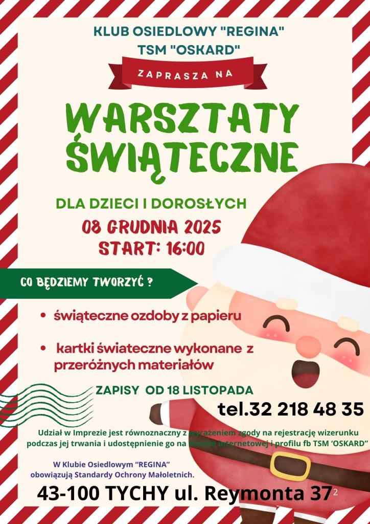Klub Osiedlowy "Regina" zaprasza na świąteczne warsztaty dla dzieci i dorosłych, które odbędą się w dniu 8 grudnia 2025 r. o godz. 16.00