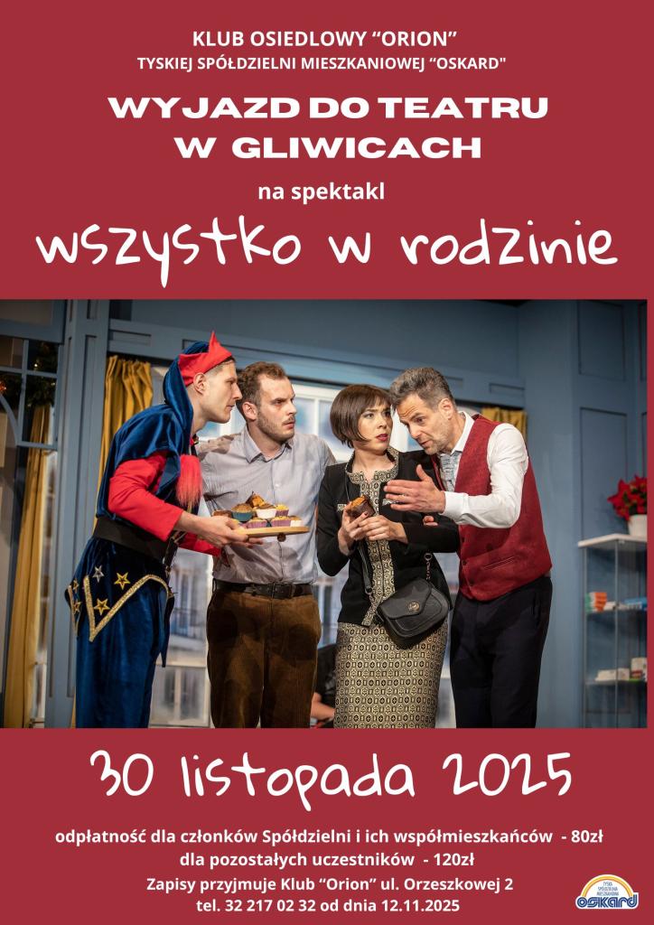 Klub Osiedlowy "Orion" ogłasza zapisy na wyjazd do teatru w Gliwicach na spektakl pt. "Wszystko w rodzinie" w dniu 30 listopada br.